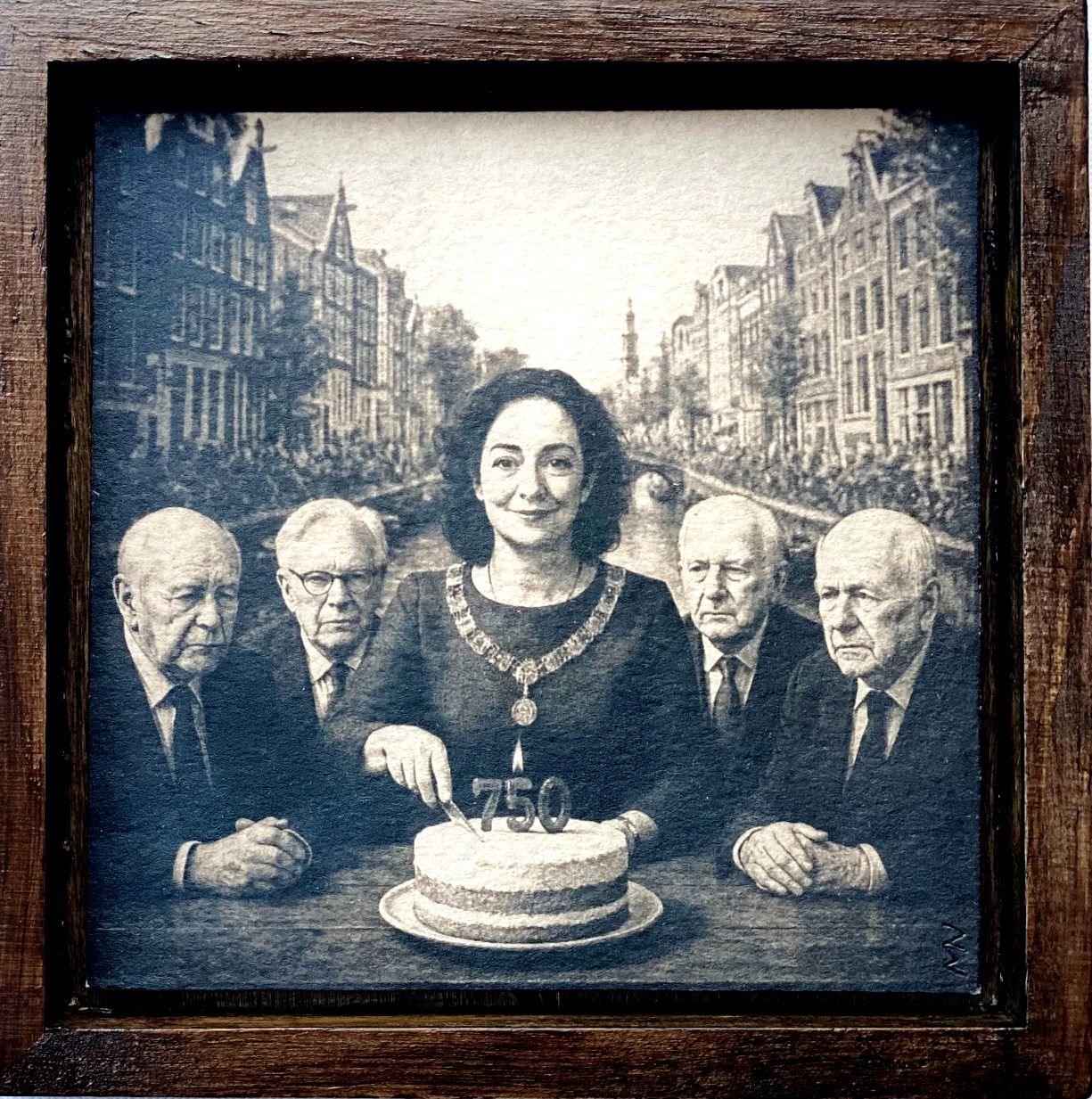 Er was iets te vieren en daar hoort naar traditie een traktatie bij, iets te eten, iets lekkers, dat ziet u hierboven op een fotogram getiteld;’De Jarige Stad’ gesitueerd in Amsterdam anno 2025, van kunstenares Mareike Naumann. https://www.mareikenaumann.com Behalve dat er iets te vieren was drukt Mareike hiermee ook symbolisch de oude traditionele bestuurscultuur met mannen uit, waar een nieuw beeld tegenover staat namelijk de eerste vrouwelijke burgemeester van de stad Amsterdam. ’Rechtop en vol trots staat ze daar en snijdt de taart aan, een handeling die symbool staat voor de start van een ander tijdperk,’ vertelt Mareike.