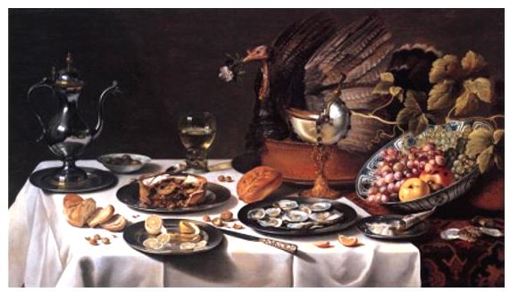 Dat was anno 2025 maar hoe was het om in 1654 iets te vieren, bijvoorbeeld op oudejaarsavond? Wat aten de mensen toen en hoe is dat in beeld gebracht? Hoe tafelden zij in de 17e eeuw, een tijd van kaarslicht, kruidige geuren en warme gezelschappen, ook wel de Gouden eeuw genoemd? Ik probeer het mij voor te stellen.