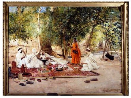 Werk van Maurice Bompard, een sfeervolle scene van een maaltijd in een oase in Algerije. Maurice Bompard 1857- 1936. Franse schilder bekend om zijn oriëntalistische stijl met vaak geromantiseerde beelden van het Midden-Oosten
