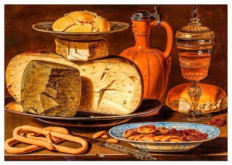 Clara Peeters [1594 Antwerpen] – Stilleven met kazen, amandelen en krakelingen: toont typische ingrediënten die ook in Joodse huishoudens voorkwamen