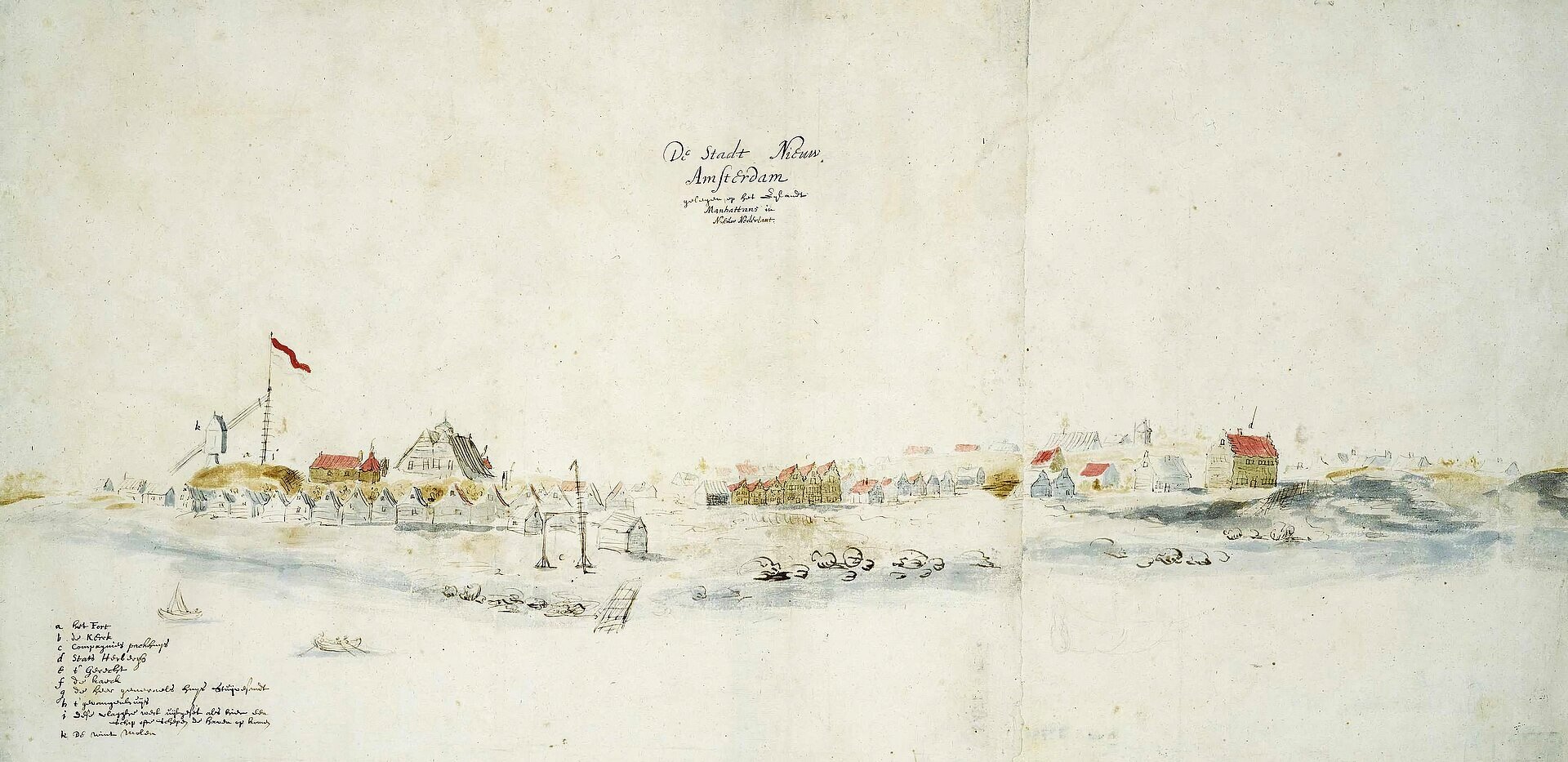 Tekening van Nieuw-Amsterdam uit 1650-1654, ontdekt in 1991 in de collectie van het Weense Albertina Museum. Het is waarschijnlijk de oudste, levensechte tekening van de kolonie