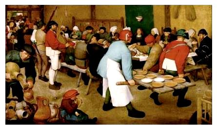 Op het schilderij van Pieter Bruegel de Oude, Boerenbruiloft [ca. 1568], zien we de boerse gulzigheid.