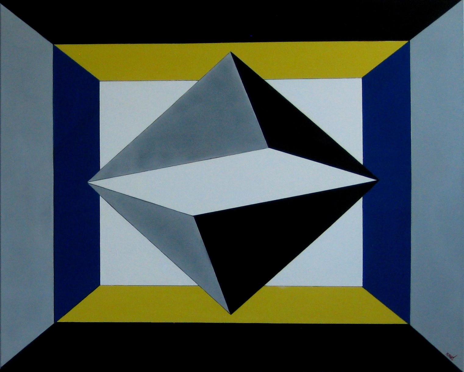 M.b.t. deze expositie het volgende: ons brein ziet van alles in een paar lijnen, samen met kleuren. Het platte vlak krijgt dan ineens diepte en dimensie, en iedereen ziet er weer wat anders in door de manipulatie van de waarneming en het optische effect dat in het werk wordt aangebracht. Mijn werk verwijst onder andere naar een uitspraak van Carl Jung: ‘Alles hangt af van hoe we dingen zien’. Voor mij is dat een vertrouwde gedachte die ik al vanaf mijn jonge jaren aanhang en waar ik in mijn werk mee bezig ben. Het boeit mij mateloos om met mijn geometrische werken optische effecten te creëren en de waarneming te manipuleren.